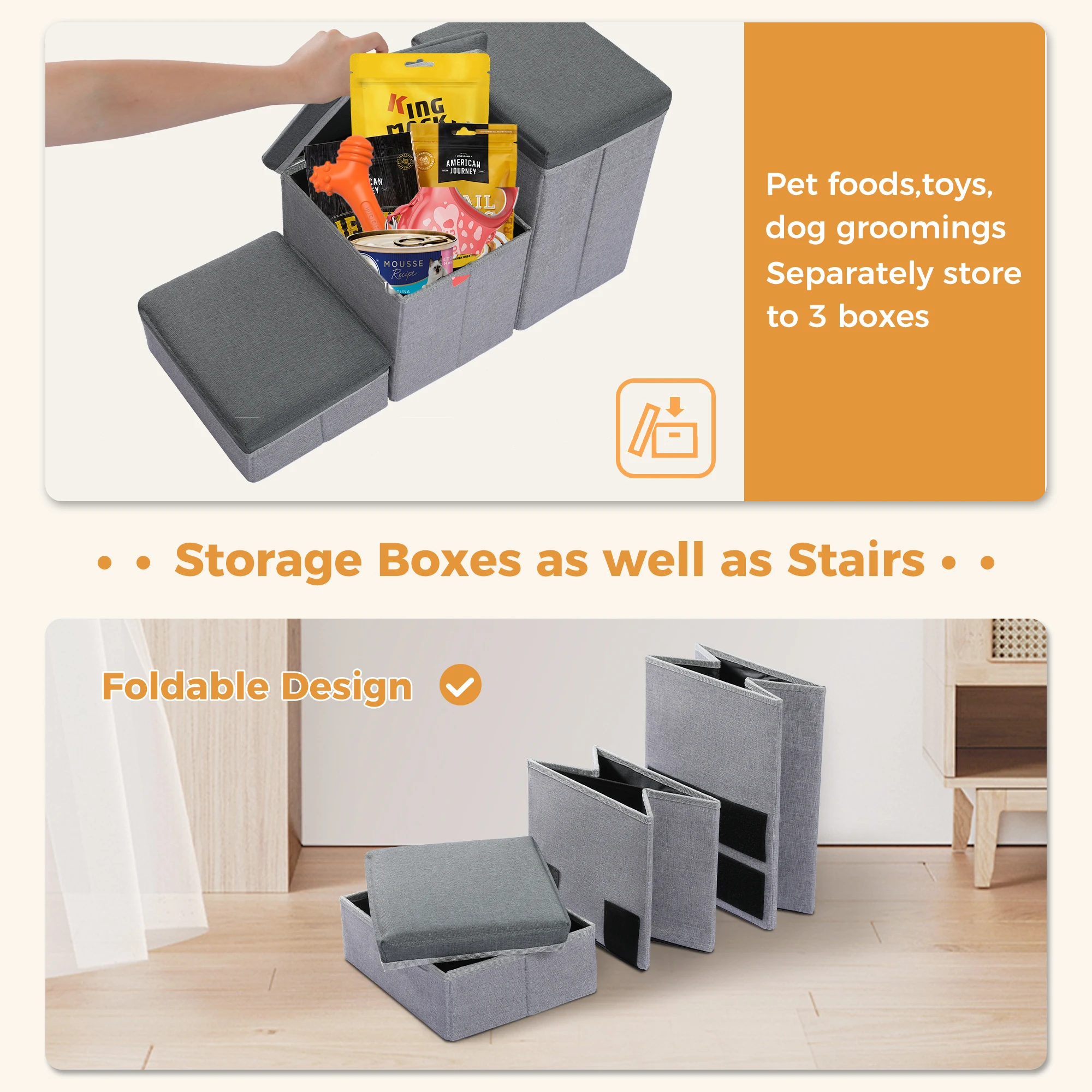 Foldable Dog Stairs with Storage Box 3-Tier Pet Stairs for Bed or Sofa Adjustable Height Cat Dog Steps Ramp for Indoor Non-Slip